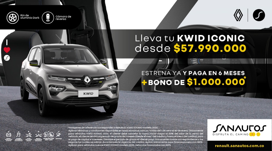 Aplica entre el 01 y 30 de enero de 2026 y únicamente para la compra de los vehículos nuevos de la de la marca Renault Kwid, Logan, Sandero, Stepway, Duster, Oroch y Kardian servicio particular modelo 2025, 2026 y 2027 (según aplique y según disponibilidad) financiados a través de RCI Colombia S.A Compañía de Financiamiento, entidad vigilada por la Superintendencia Financiera de Colombia.