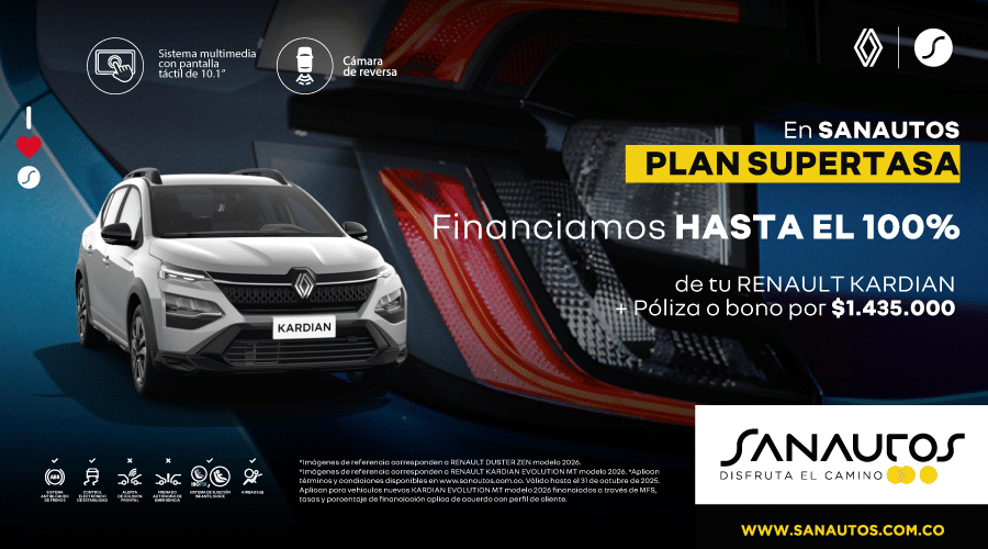 Aplica entre el 01 y 31 de octubre de 2025 y únicamente para la compra de vehículos nuevos de la marca Renault, particular y público, Kwid, Logan, Sandero, Stepway, Duster, Oroch, Koleos, Kardian, Arkana, y Megane E-Tech modelo 2025 y 2026 (según aplique y según la disponibilidad del vehículo), financiados a través de RCI Colombia S.A Compañía de Financiamiento, entidad vigilada por la Superintendencia Financiera de Colombia.